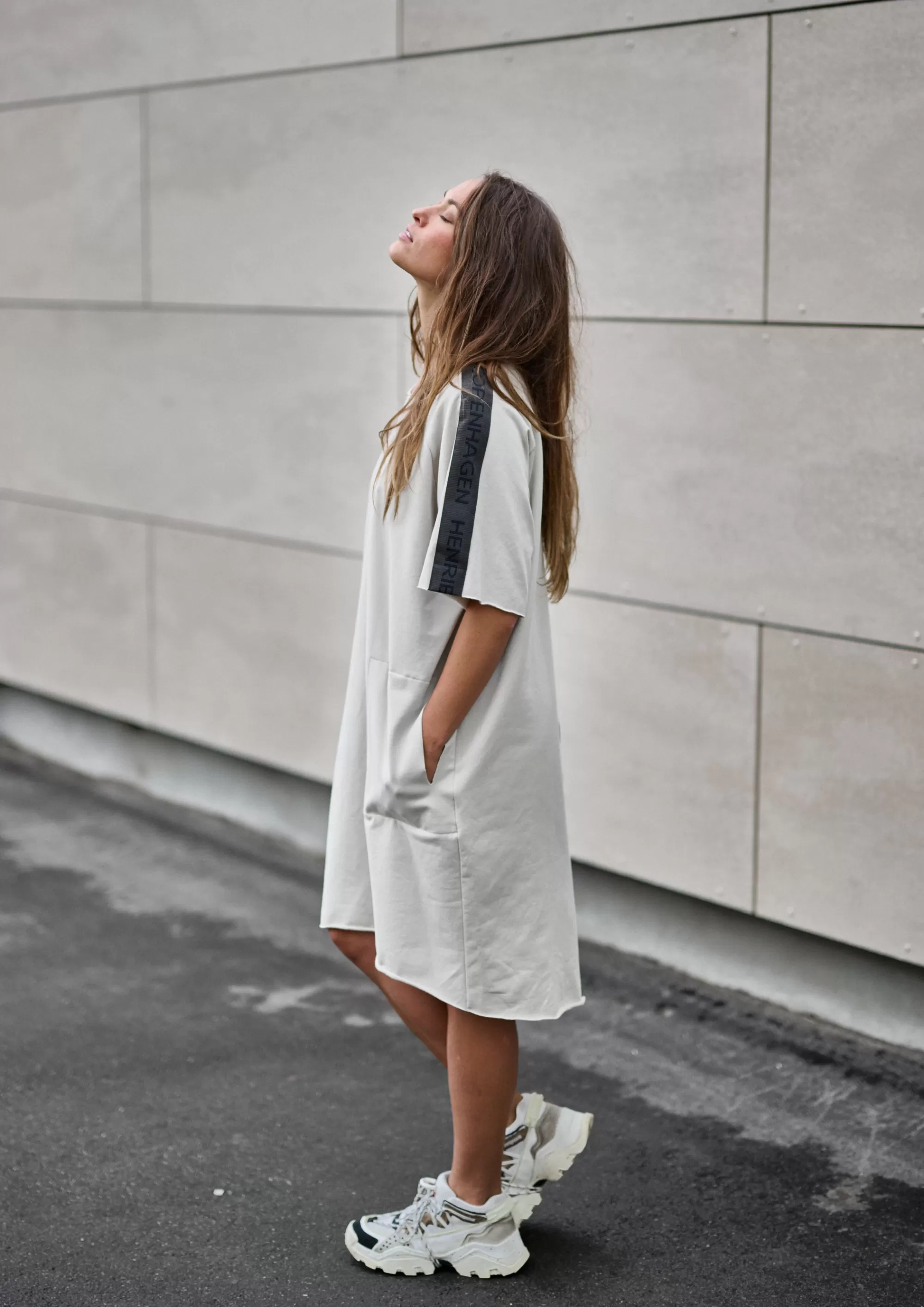 Kastige Kleid mit Logo-Band auf der Rückseite. Die rohen Kanten setzen einen schönen Kontrast zum Kleid. Dieses Kleid wird ein Must-have in Ihrem Kleiderschrank sein. Es wird Ihr Go-to-Kleid sein, wenn Sie nicht wissen, was Sie anziehen sollen. Tragen Sie es im Büro, wenn Sie sich entspannen oder stylen Sie es mit Ihrem Lieblingsschmuck, wenn Sie sich elegant kleiden müssen.