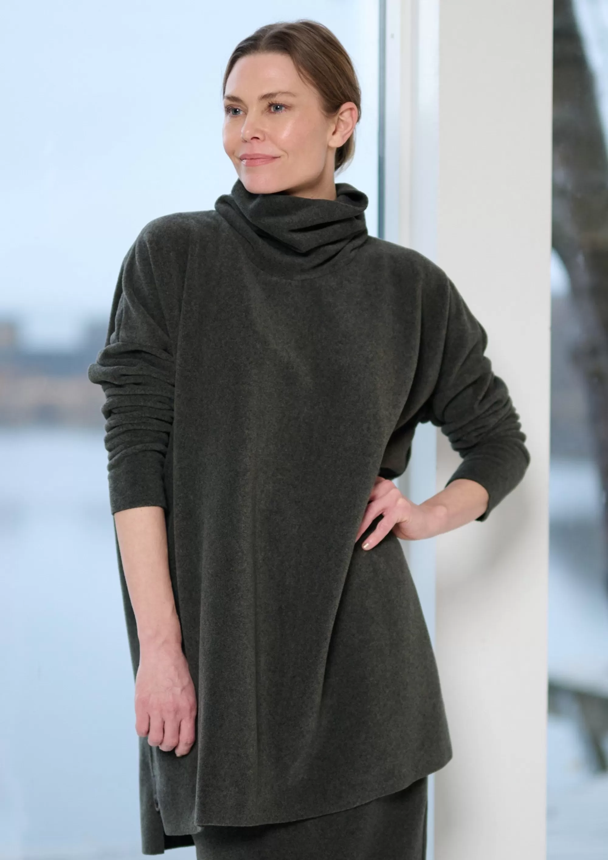 Tunika in Kastenform mit lockerer Passform und engeren Ärmeln. Die Tunika ist hinten länger und hat seitliche Schlitze.