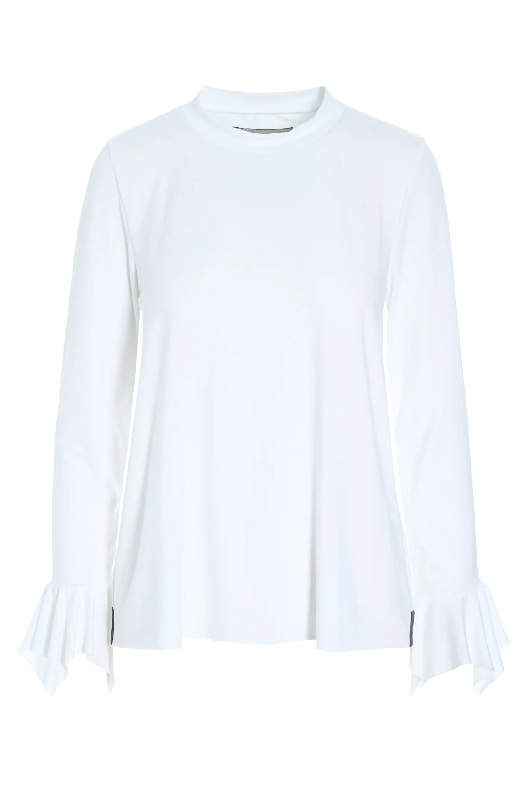 Feminine Bluse mit Rollkragen und einer leichten A-Form. Die Manschetten sind von den großen Rüschen vergangener Zeiten inspiriert. Es ist ein feines Detail sowohl mit als auch ohne Blazer darüber. Tragen Sie die Bluse sowohl mit einem Rock als auch mit Ihren Lieblingsjeans.
