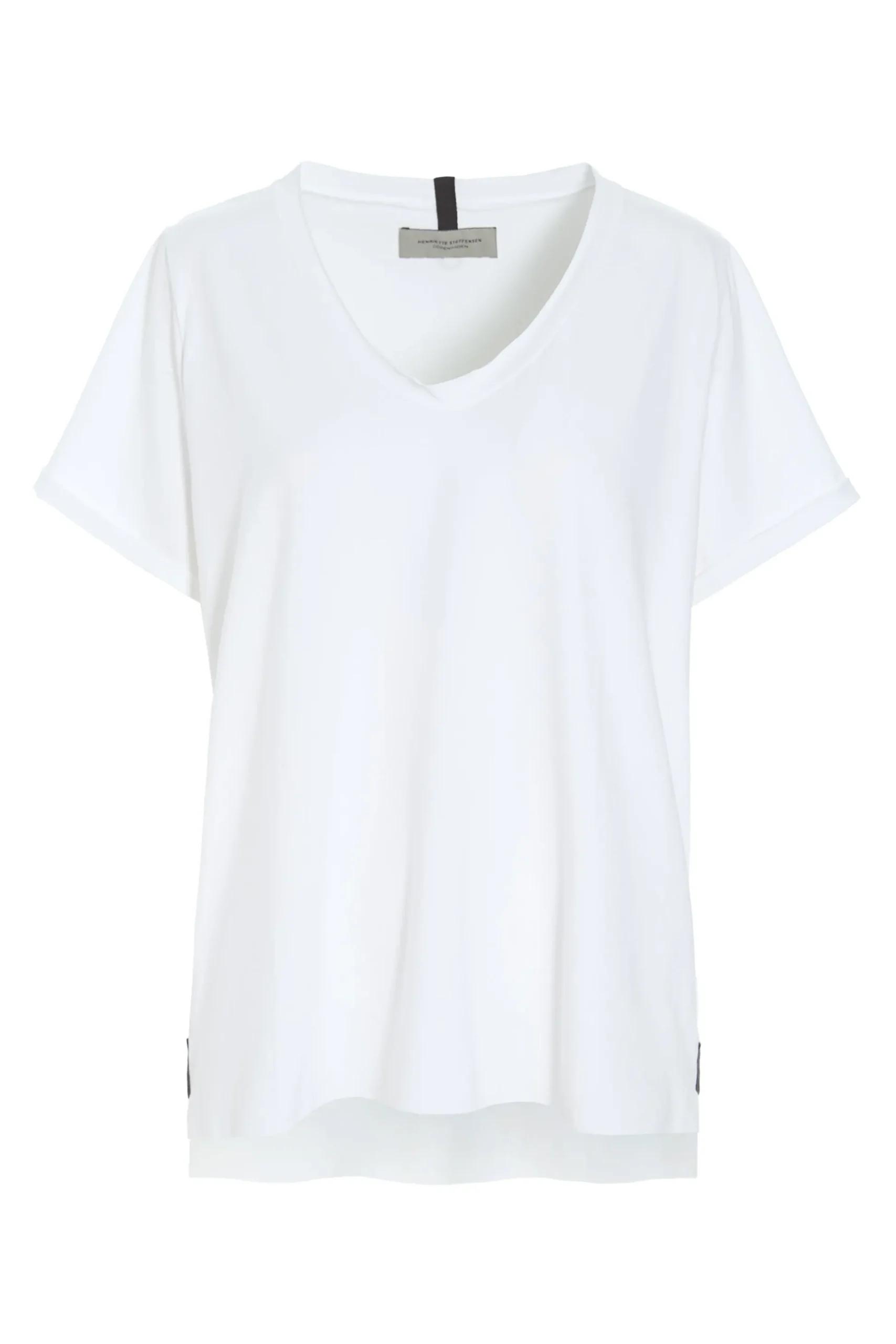 Lässige Bluse in Onesize-Größe mit V-ausschnitt und versetzten Nähten. Sie hat einen rundes Bündchen und ist sowohl vorne als auch hinten kürzer, wo sie über das Gesäß reicht. Schöne handgezeichnete Libelle.