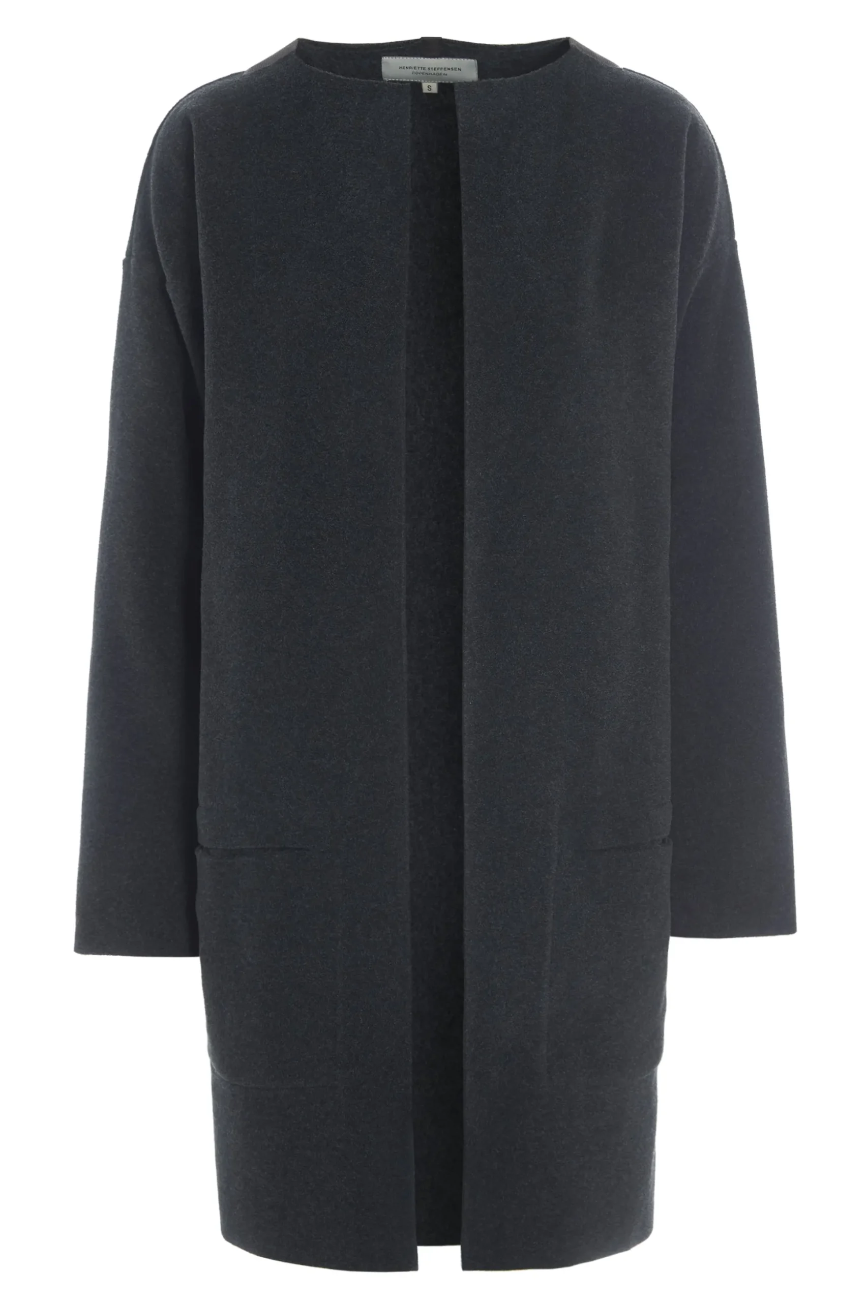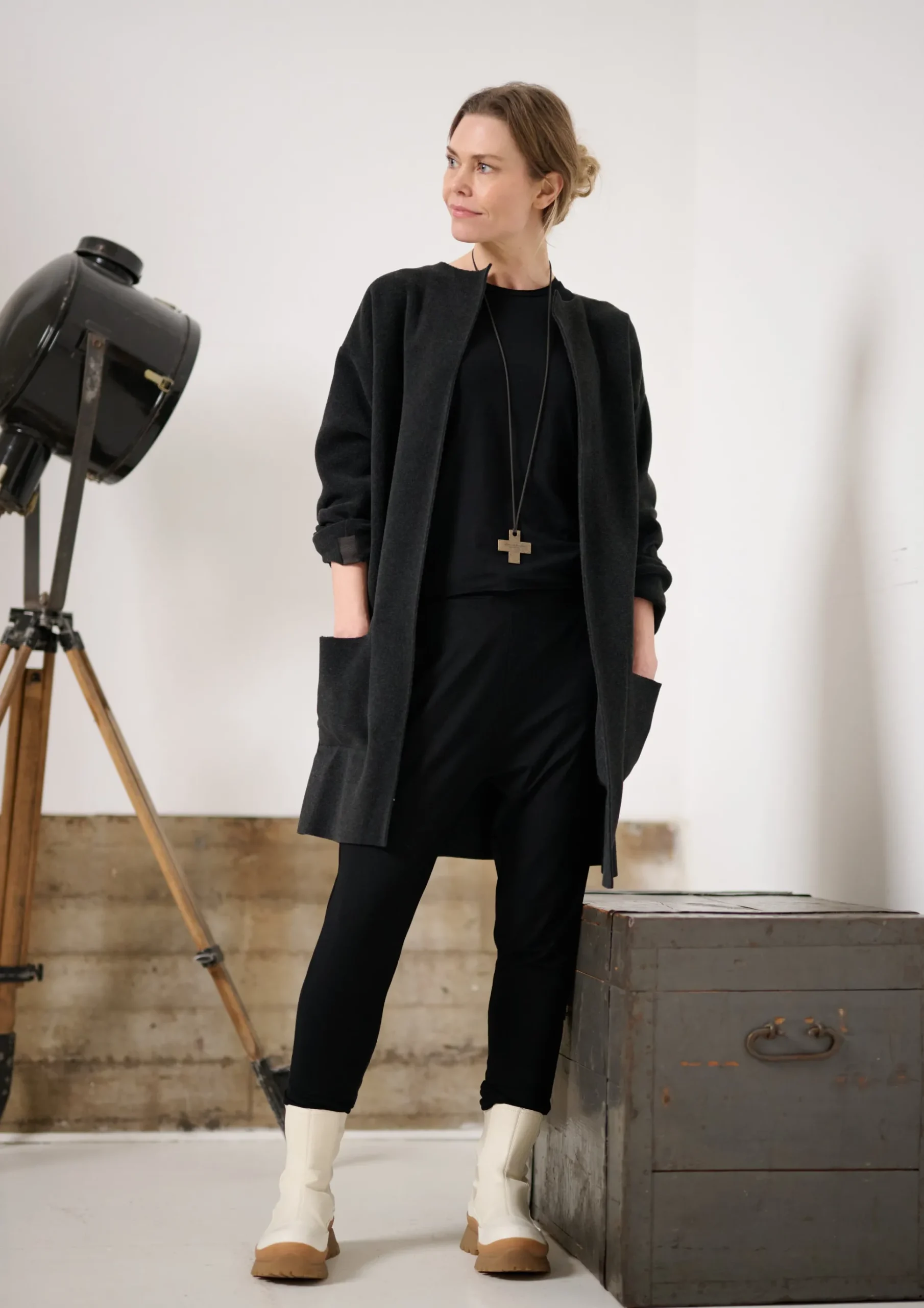 Klassischer Cardigan mit Rundhalsausschnitt und Taschen. Länge bis zur Mitte der Oberschenkel. Wählen Sie Ihre normale Größe.