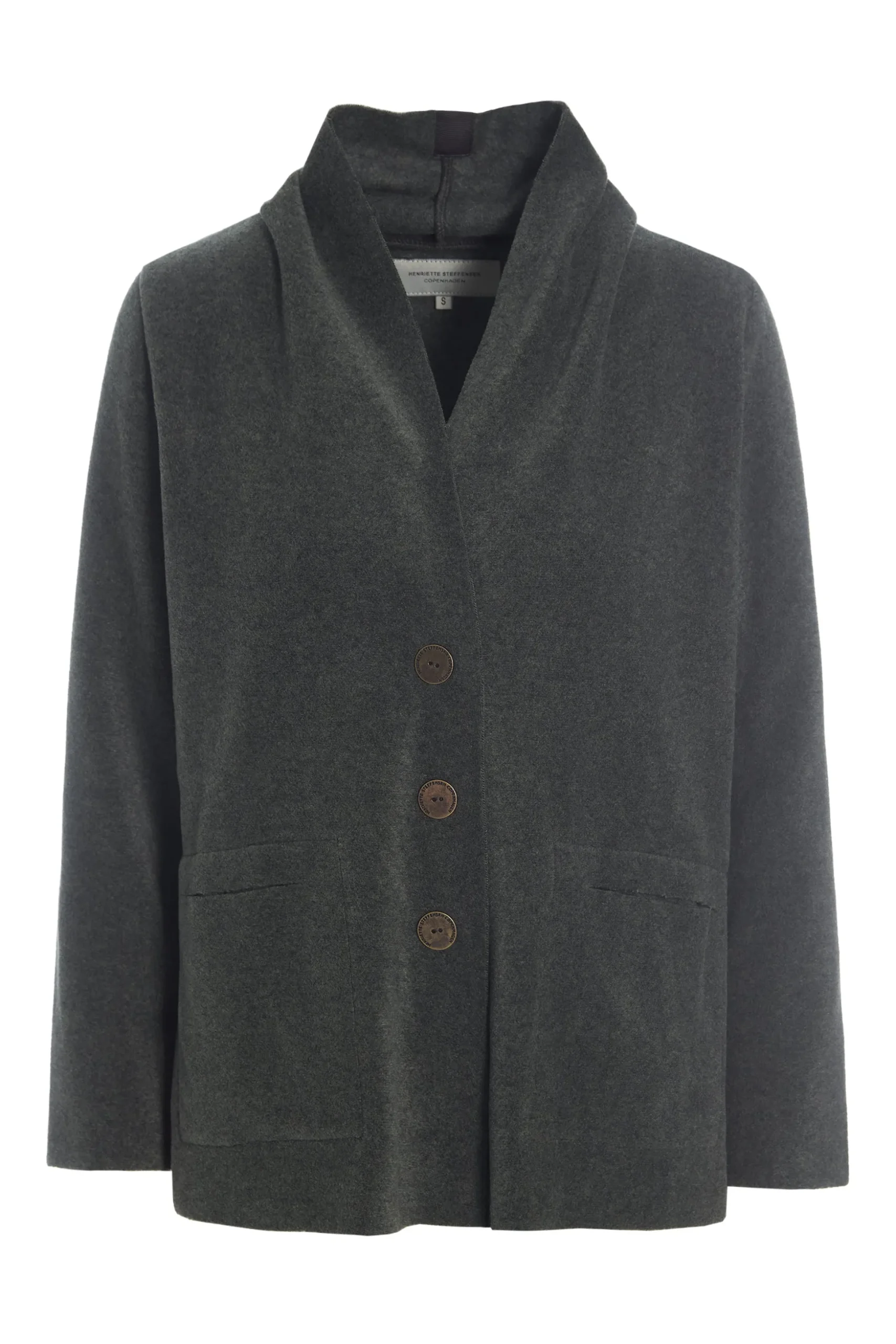 Kurze Strickjacke mit Schalkragen, Taschen und Knopfleiste. Kurze Version des Bestsellers 7162. Wählen Sie Ihre reguläre Größe wie das Model oder entscheiden Sie sich für eine übergroße Passform für eine lockerere Passform.