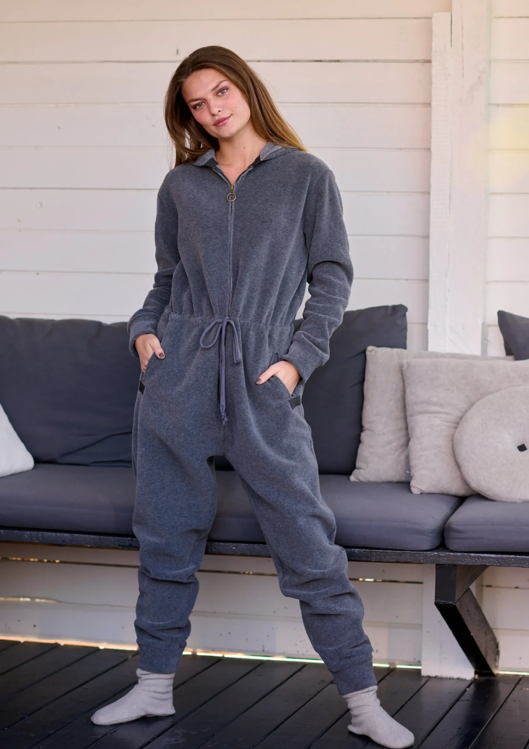 Geräumige und bequeme Jumpsuit mit Messingreißverschluss, Krawatte in der Taille, Kapuze und Taschen. Genießen Sie das weiche Gefühl in diesem einteiligen Anzug. Perfekt zum Kuscheln nach einem Ausflug ins kalte Meer!