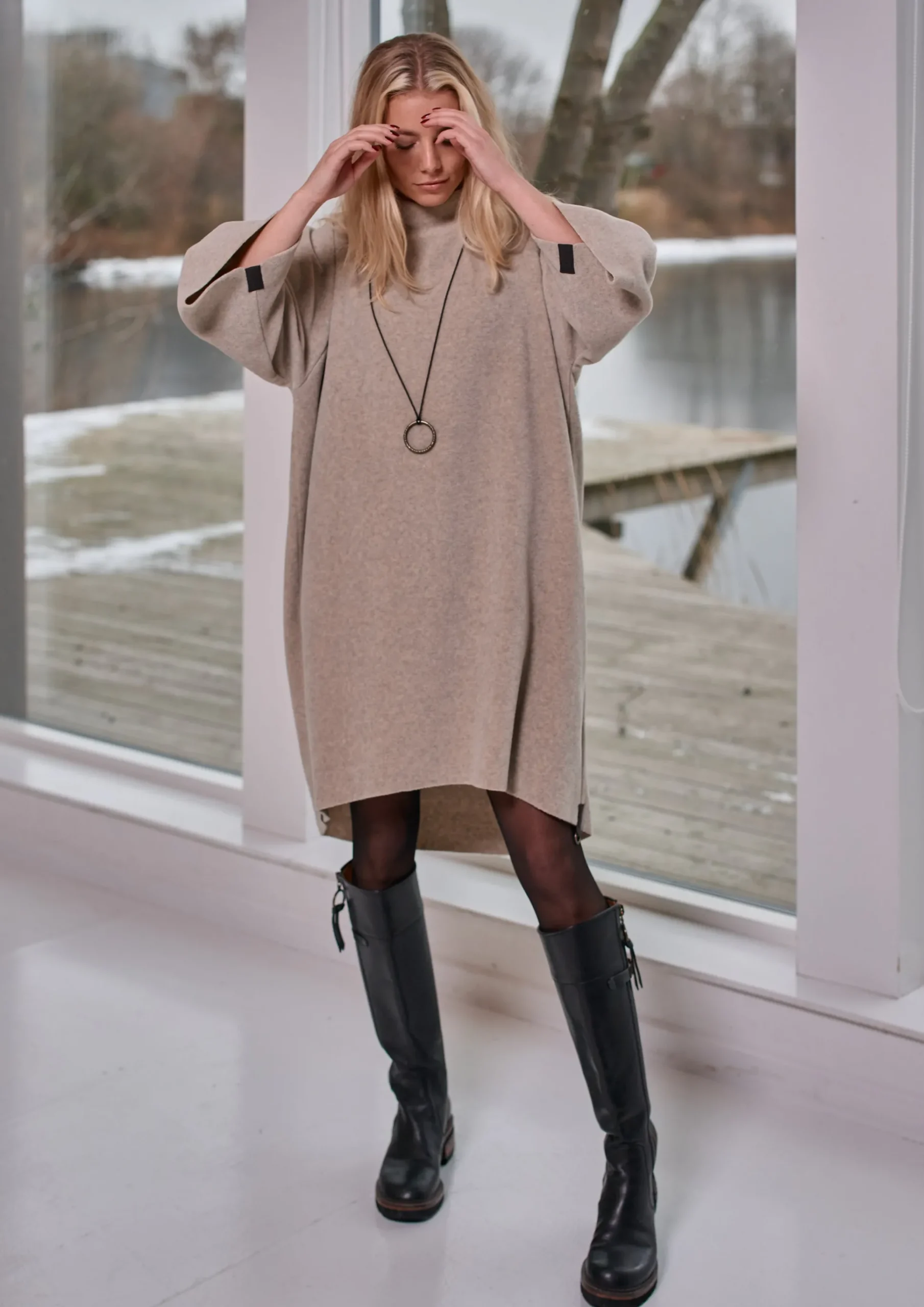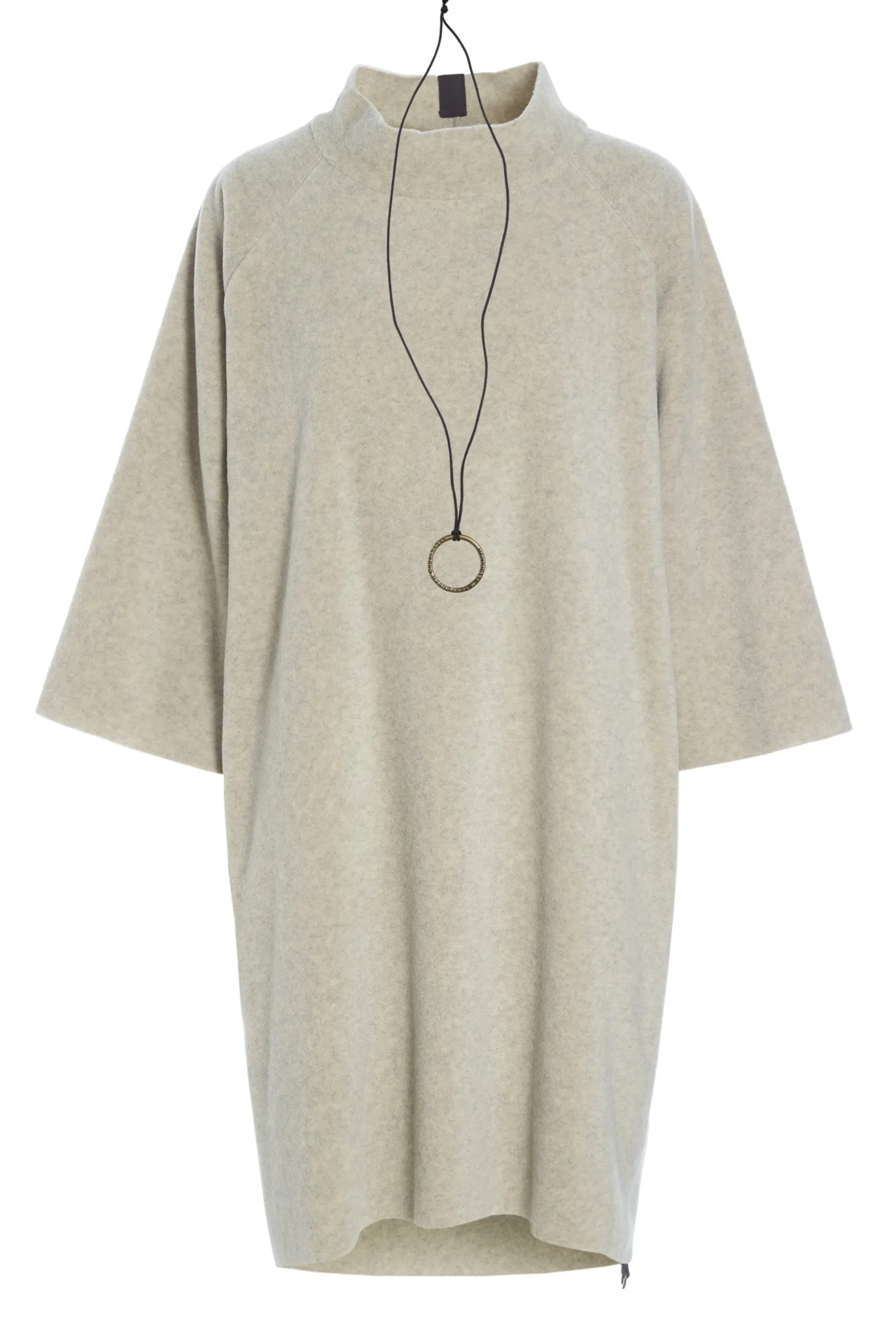 Klassisches, hochgeschlossenes Kleid mit Raglanärmeln und unserer charakteristischen Halskette – perfekt für Herbst und Winter. Unsere charakteristische Kette ist handgefertigt und besteht aus einem metallenen, auf eine Baumwollschnur gefädelten, runden Logo.