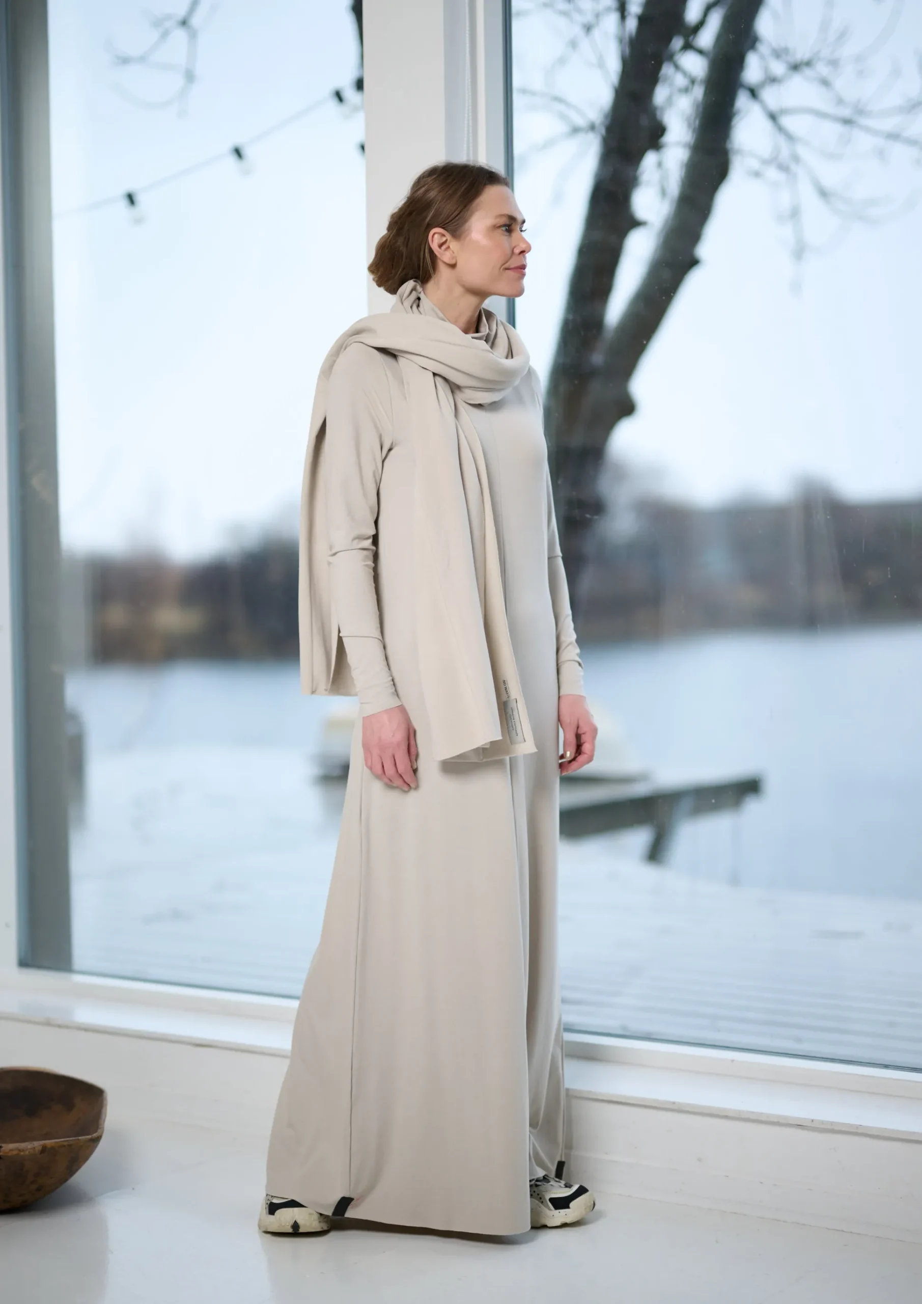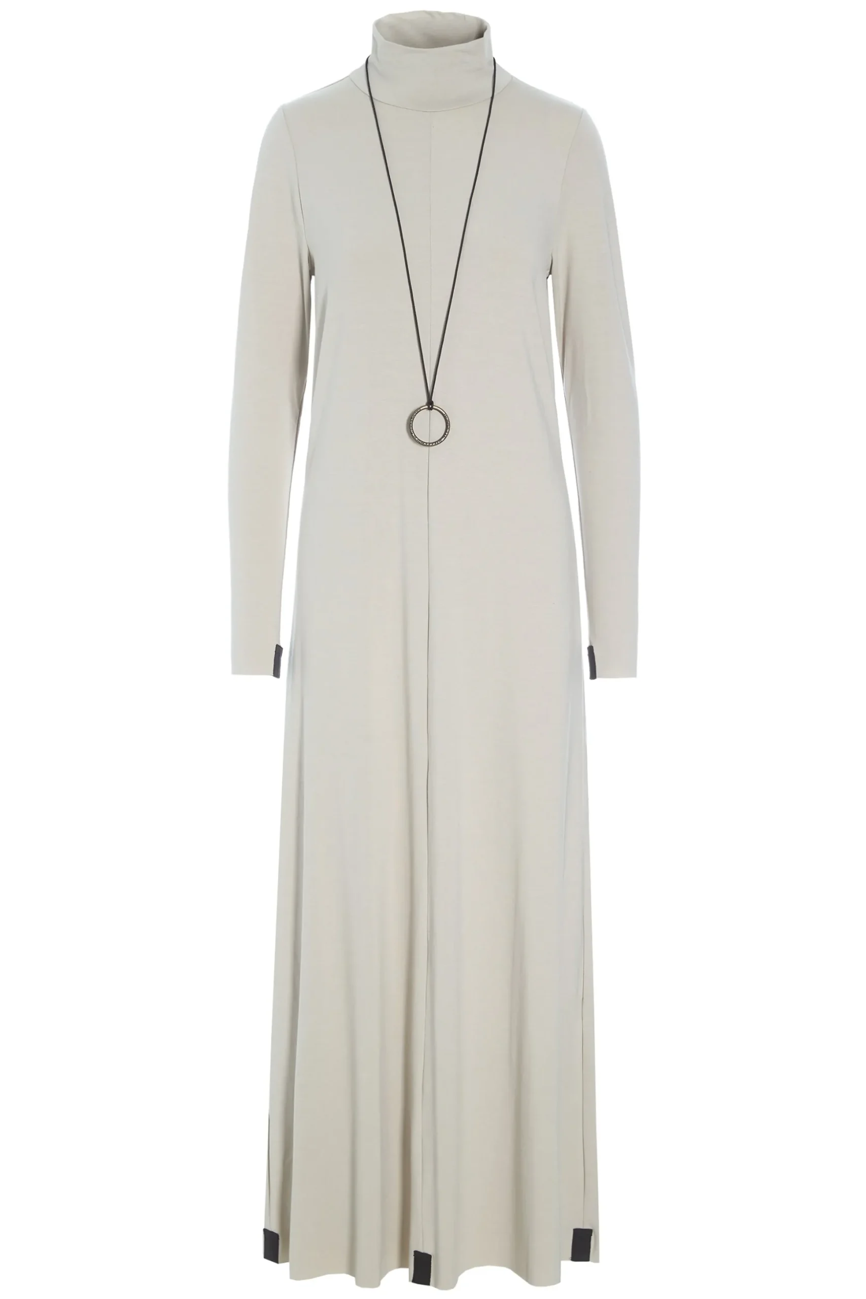 Langes feminines Kleid mit hohem Ausschnitt und Einsätzen vorne und hinten in der Mitte, um die Passform feminin und elegant zu gestalten.