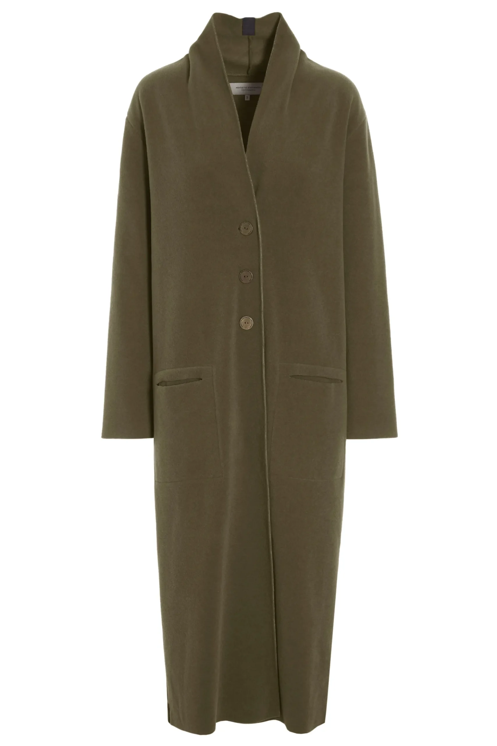 Langer Cardigan mit großem Kragen, Taschen und drei Messingknöpfen auf der Vorderseite.