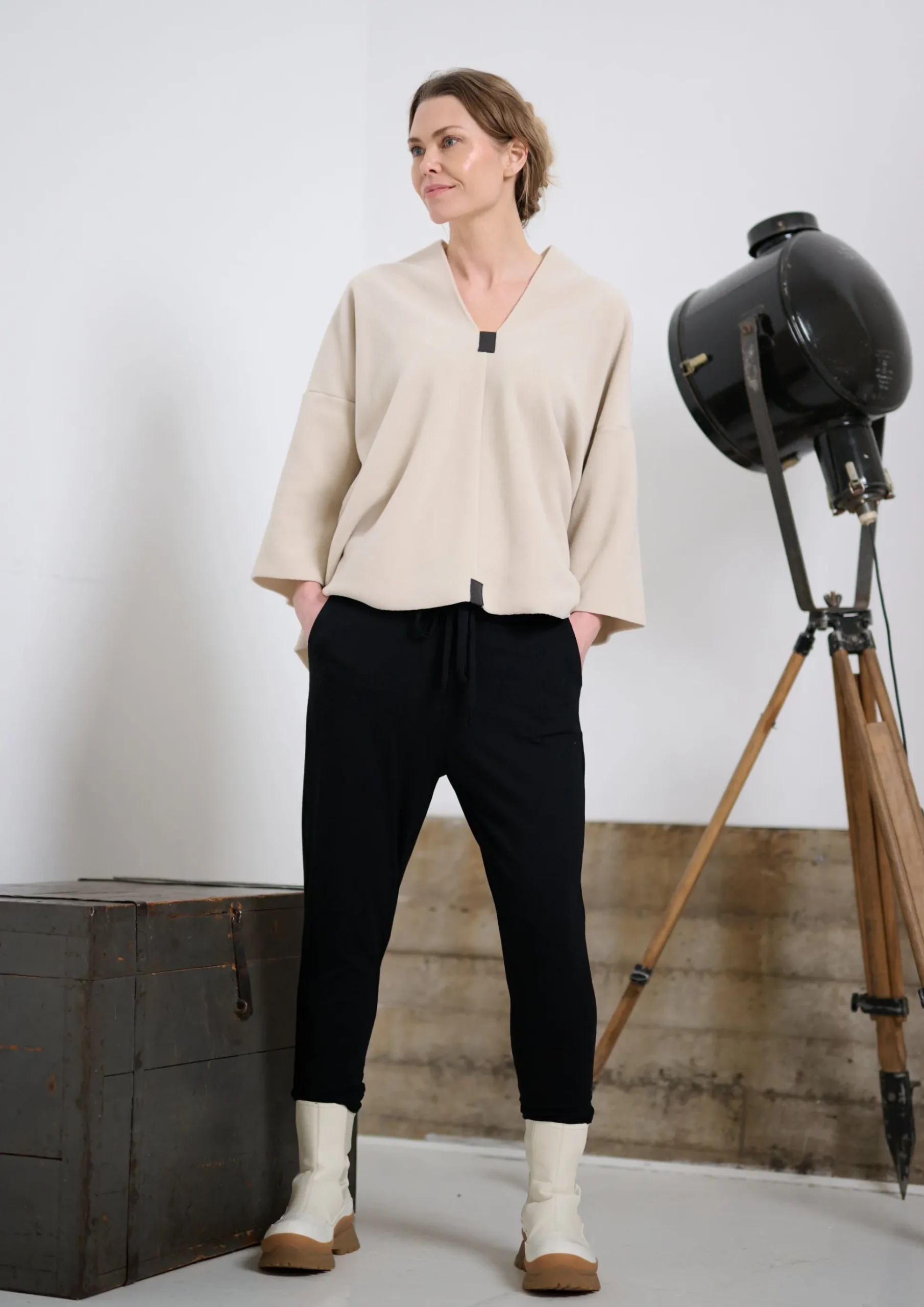 Lässiger Fleece-Pullover in lockerer Passform mit einem Schalkragen. Die Bluse hat einen geräumigen und legeren Stil. Dieser Stil ähnelt unserem Pullover style Nr. 1361 – nur mit längeren Ärmeln! Die Länge des Schlitzes ermöglicht es Ihnen, ihn ohne Oberteil darunter zu tragen.