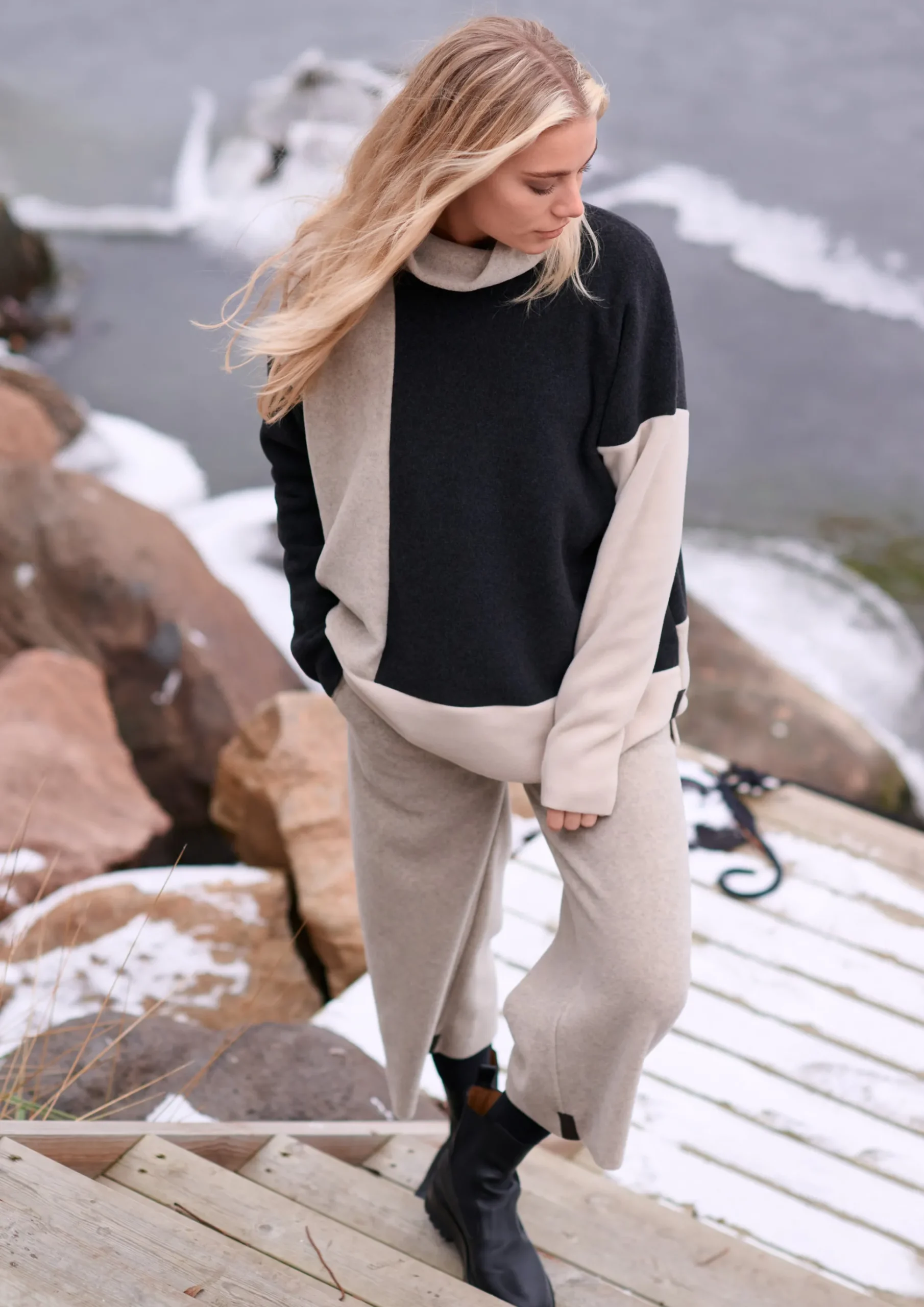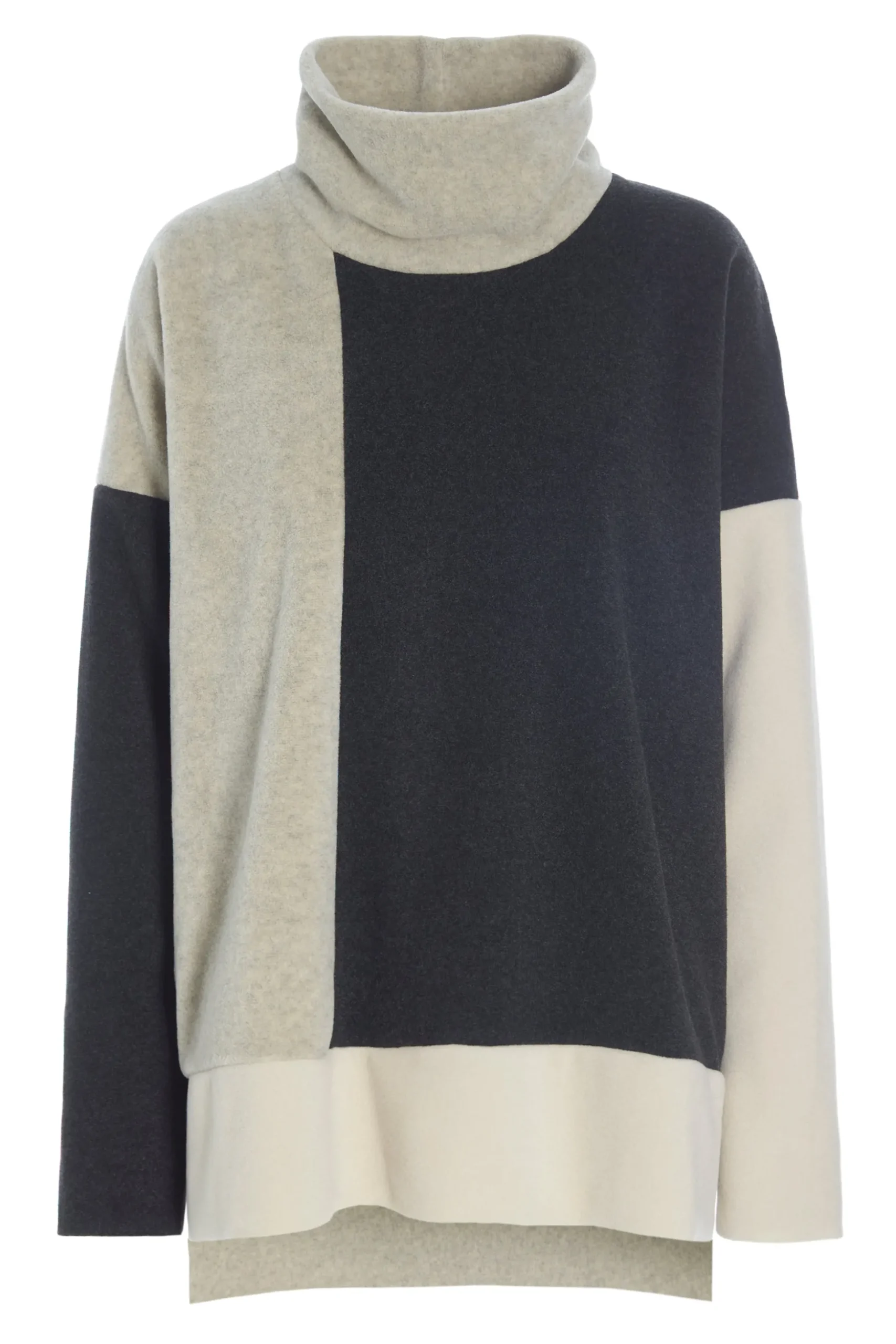 Mehrfarbiges kastenförmiges Pullover mit hohem Kragen. Der Pullover ist hinten länger und hat Schlitze an den Seiten. Als Teil unserer PATCH-Linie gibt es diesen Pullover in verschiedenen Kombinationen unserer klassischen, weichen Farben.