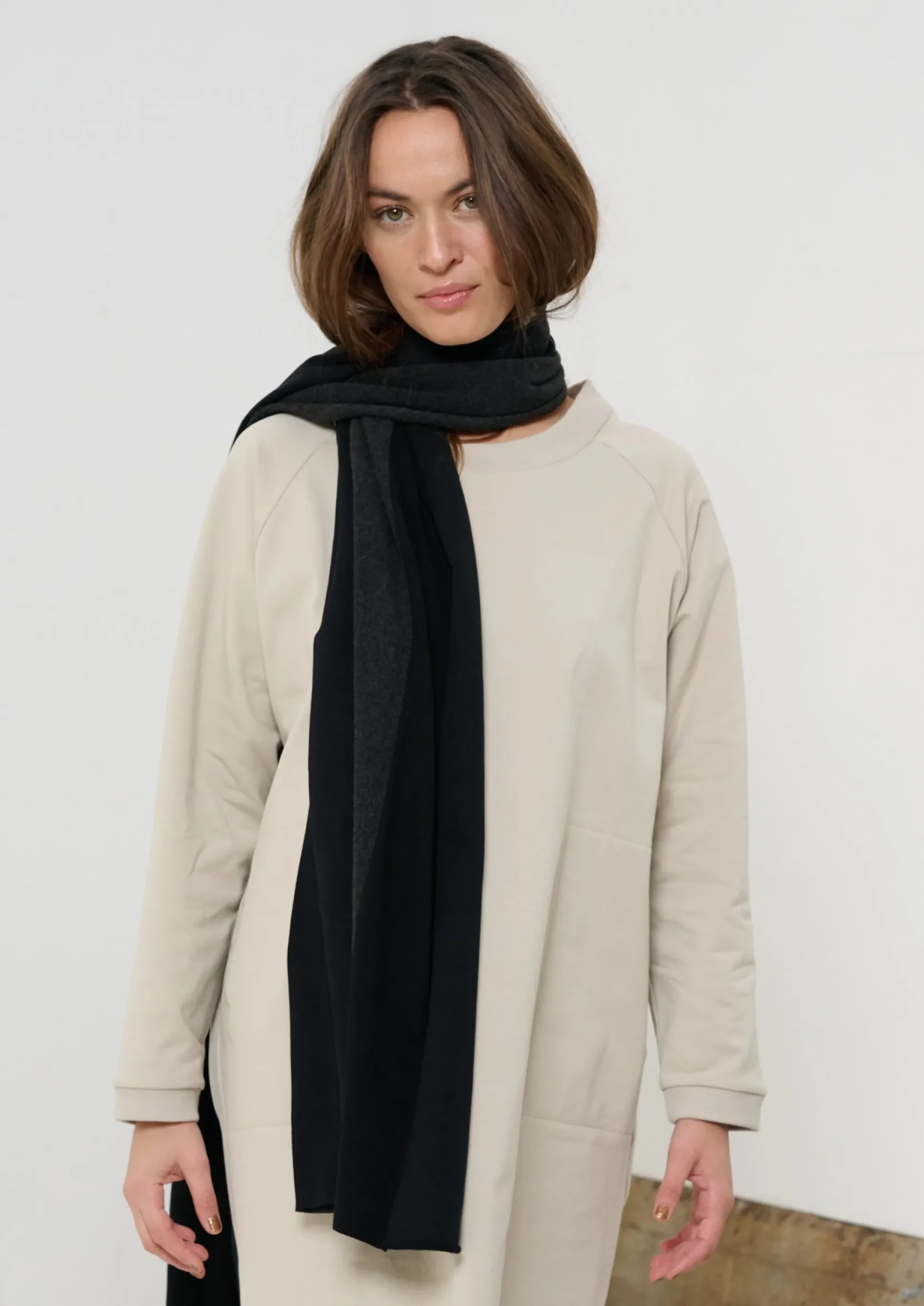 Der Schal ist aus Stoffresten gefertigt, die normalerweise zerstört werden würden. Unsere 3 Qualitäten – Fleece, Jersey und Bio-Baumwolle sind enthalten, die Farben sind ton-in-ton. Wir lieben den unterschiedlichen Ausdruck, den jede Qualität in derselben Farbe hat. Sie können sie mit fast allem in der Kollektion kombinieren und anpassen.