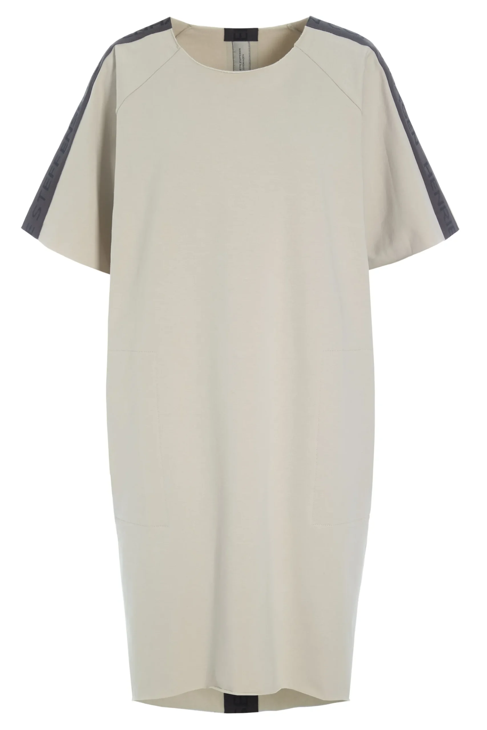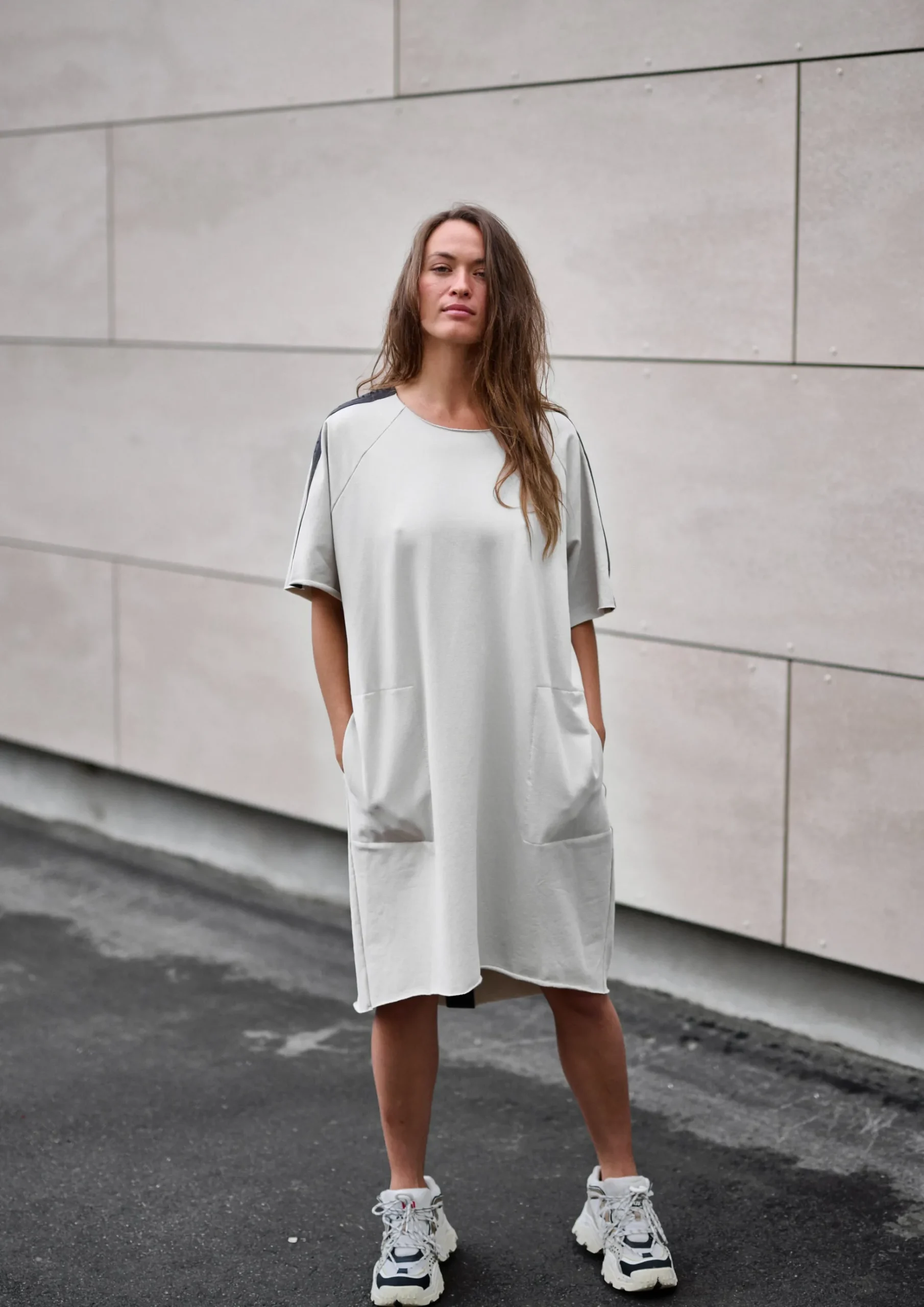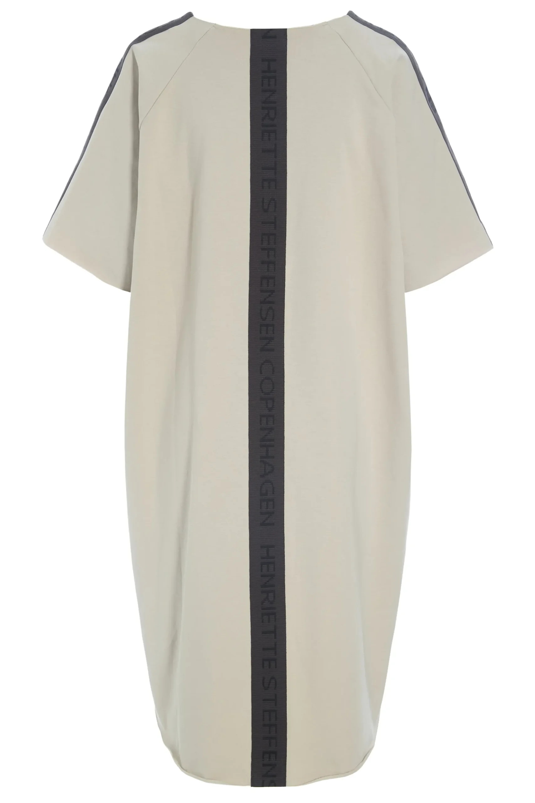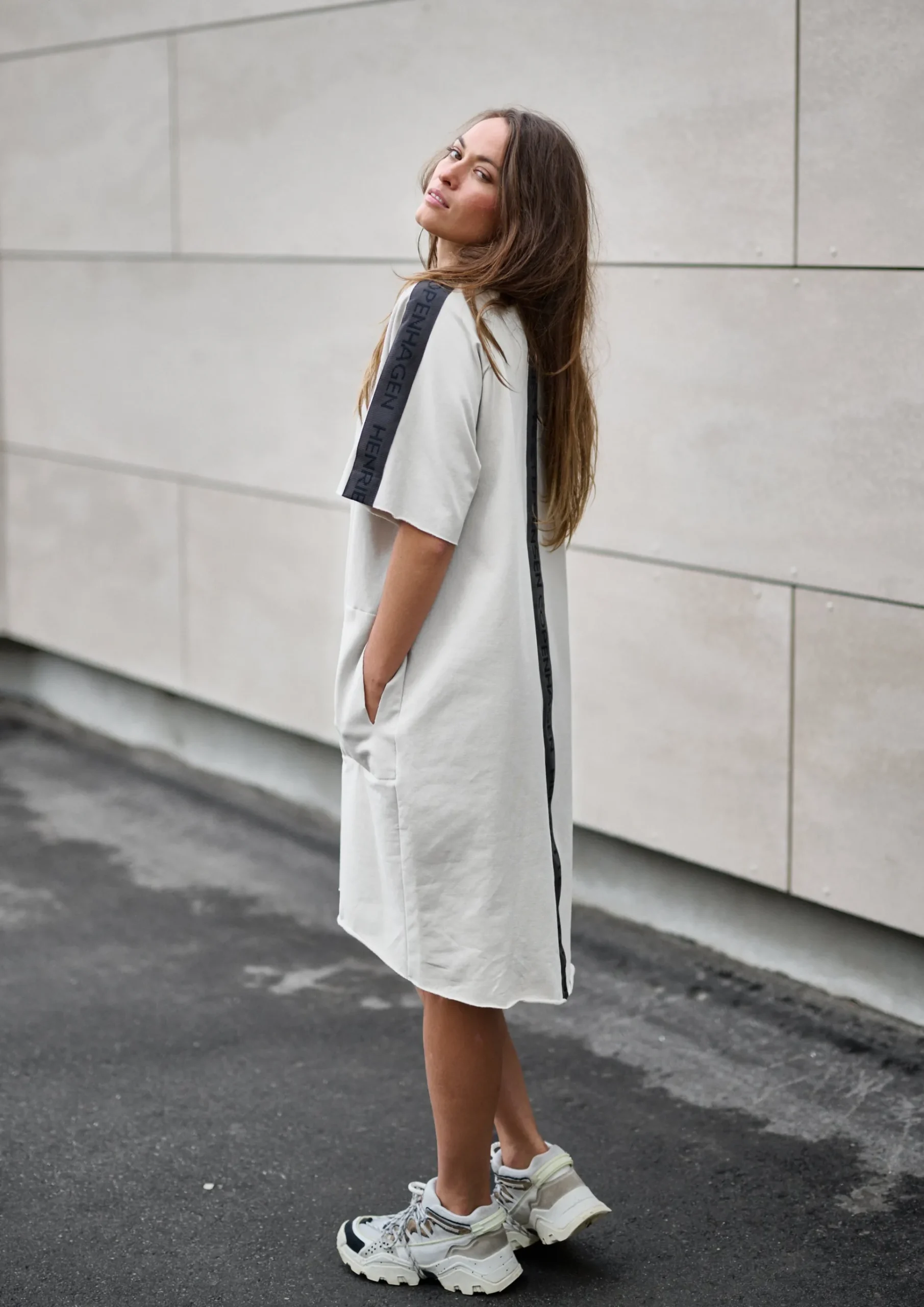 Kastige Kleid mit Logo-Band auf der Rückseite. Die rohen Kanten setzen einen schönen Kontrast zum Kleid. Dieses Kleid wird ein Must-have in Ihrem Kleiderschrank sein. Es wird Ihr Go-to-Kleid sein, wenn Sie nicht wissen, was Sie anziehen sollen. Tragen Sie es im Büro, wenn Sie sich entspannen oder stylen Sie es mit Ihrem Lieblingsschmuck, wenn Sie sich elegant kleiden müssen.
