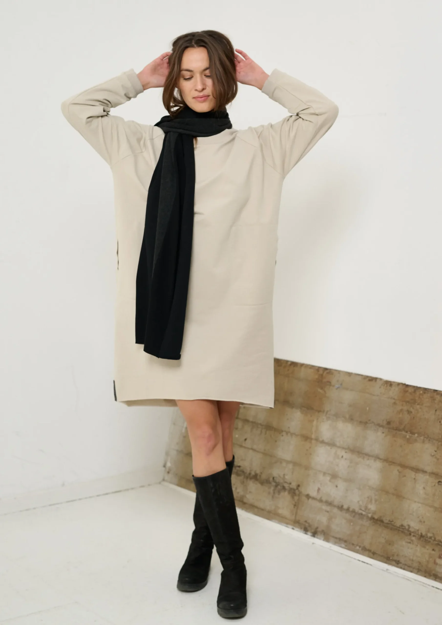 Kastenkleid mit Raglanärmeln und Logo-Band auf der Rückseite. Die rohen Kanten setzen einen schönen Kontrast zum Kleid. Dieses Kleid wird ein Muss in Ihrem Kleiderschrank sein. Es wird Ihr Kleid sein, wenn Sie nicht wissen, was Sie tragen sollen. Tragen Sie es im Büro, wenn Sie sich entspannen, oder stylen Sie es mit Ihrem Lieblingsschmuck, wenn Sie sich schick machen müssen.