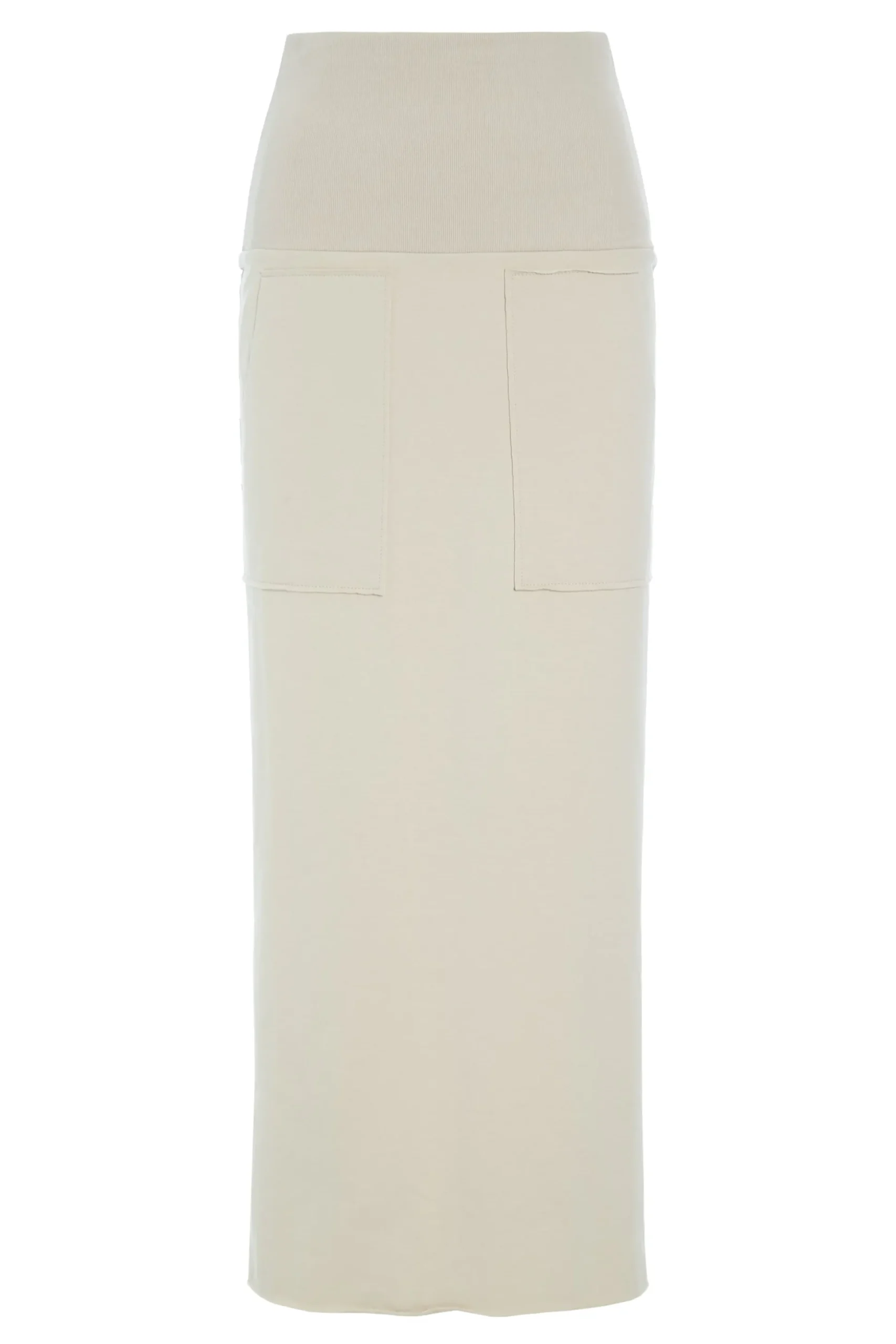 Langer Rock mit hoher Taille aus Doppelripp. Tragen Sie ihn hoch in der Taille oder umgeschlagen. Der Rock hat Taschen mit rohen Kanten und einen Schlitz in der Mitte hinten, abgerundet mit einem Logo-Band.
