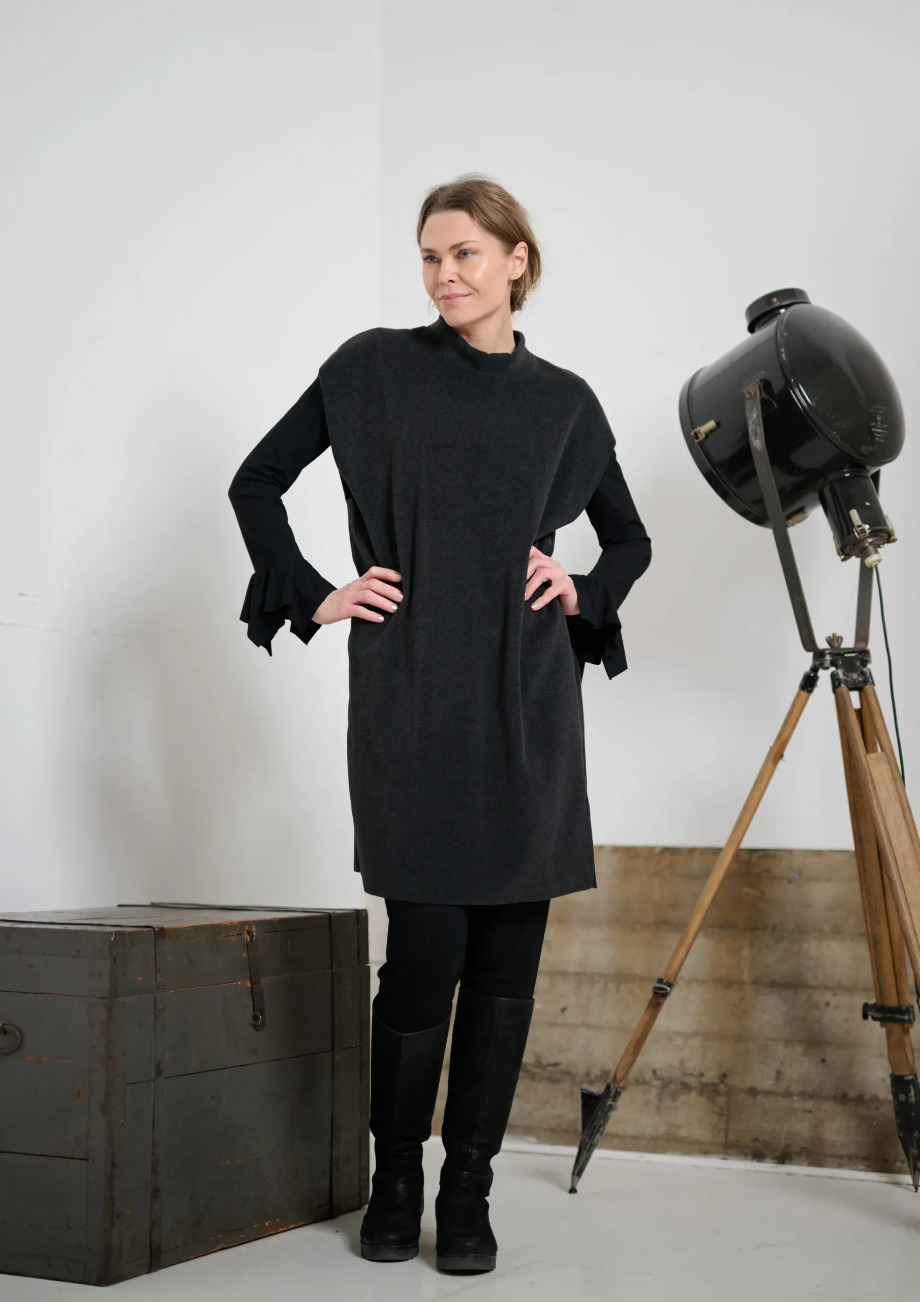 Stylen Sie sie mit Ihren Lieblingsstiefeln und einem Schal für einen legeren Look oder kleiden Sie sie mit einem Paar Absätzen auf. Fügen Sie einen Gürtel hinzu, wenn Sie Ihre Taille betonen möchten.