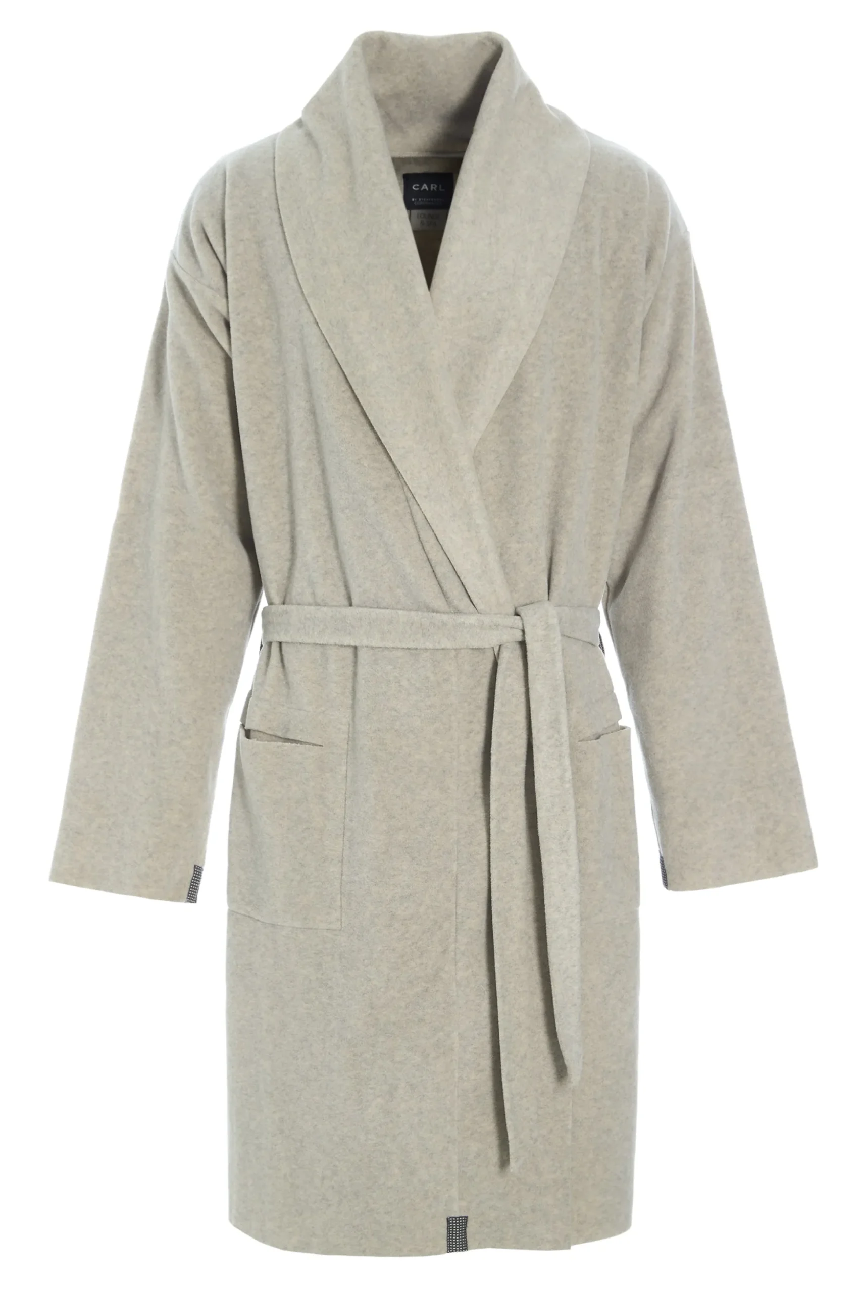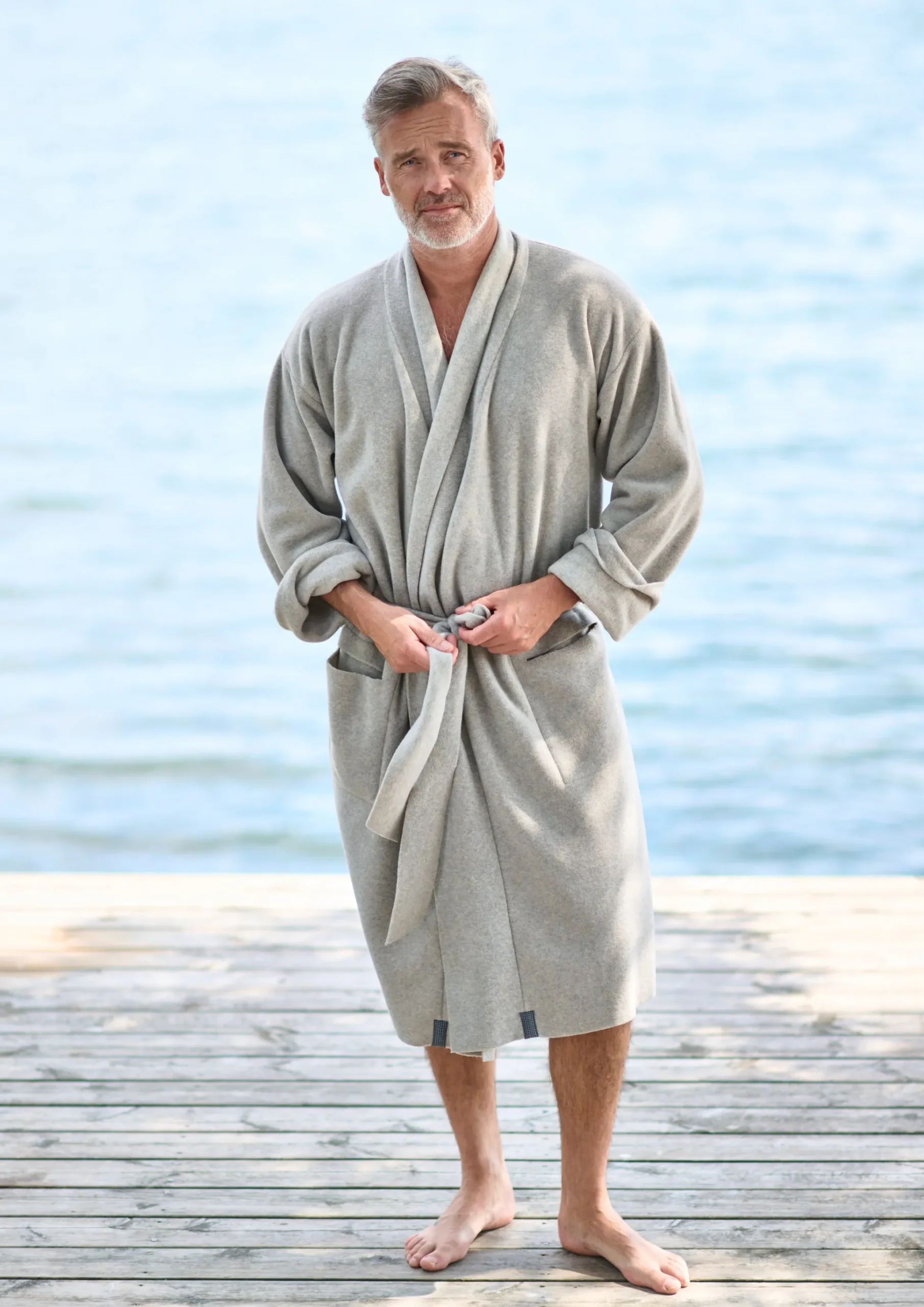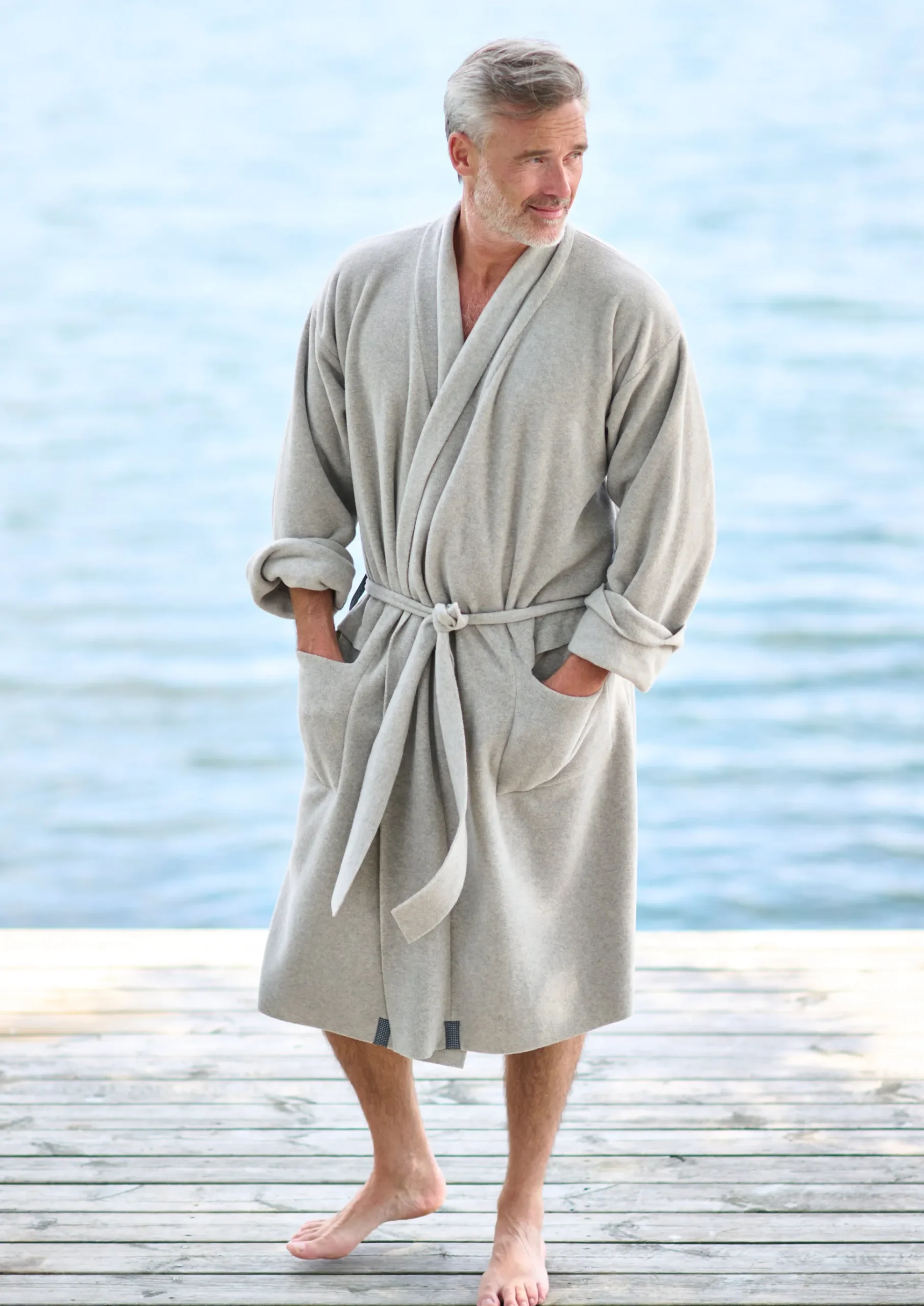 Dieser Bademantel aus Fleece ist warm und kuschelig, wiegt beinahe nichts und ist langlebig. Das Kleidungsstück hat einen hohen Kragen, Taschen und einen Gürtel zum Zubinden.