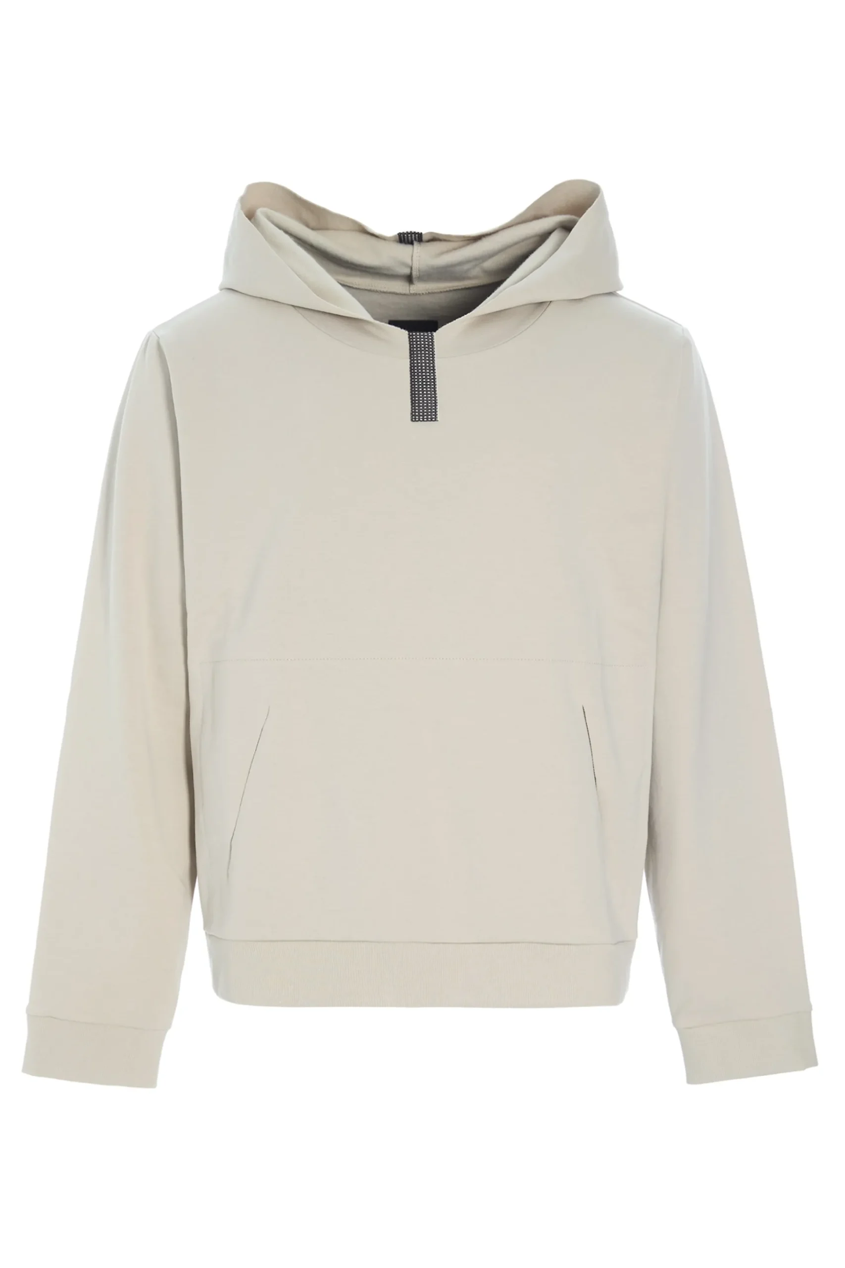 Klassischer Kapuzenpullover mit Vordertasche, Kapuze mit rohen Kanten und elastischen Bündchen an Taille und Ärmeln. Der Kapuzenpullover kombiniert die klassischen Details eines Hoodies mit einer Prise roher Elemente.